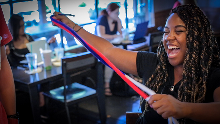 Показываем три веревки разных цветов, которые открыто связаны между собой.  Удивительно, но узлы развязываются, и веревки превращаются в одну длинную трехцветную радужную веревку!  Вы закончили, и теперь все можно тщательно осмотреть!